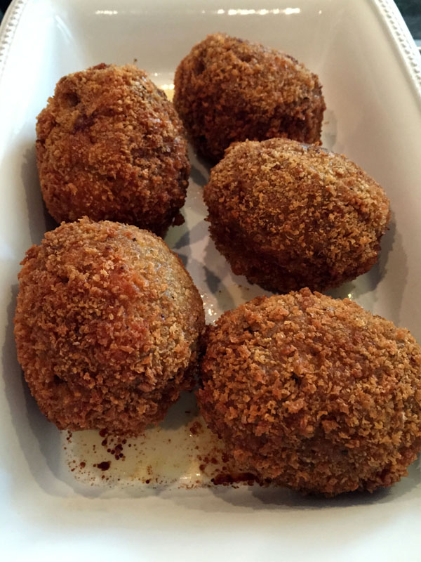 We finished our Scotch Eggs in a 350 degree oven for about 10 minutes before serving.  While I lost the ‘soft’ center eggs I was hoping for, we sliced into amazing.  What a treat.  Clearly not a recipe we’ll create weekly, but a fantastic splurge kind of dish.