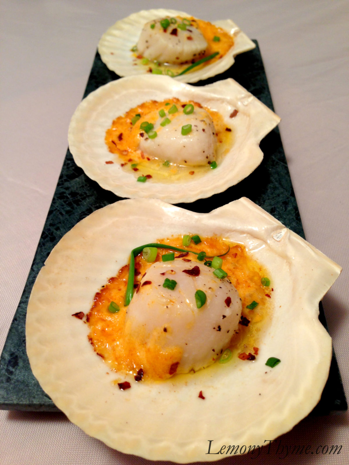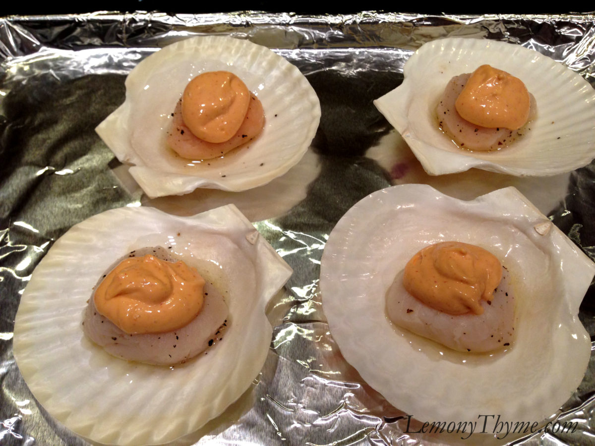 - Place scallop shells on a baking sheet. Top each with a sea scallop and dollop of spicy mayo.