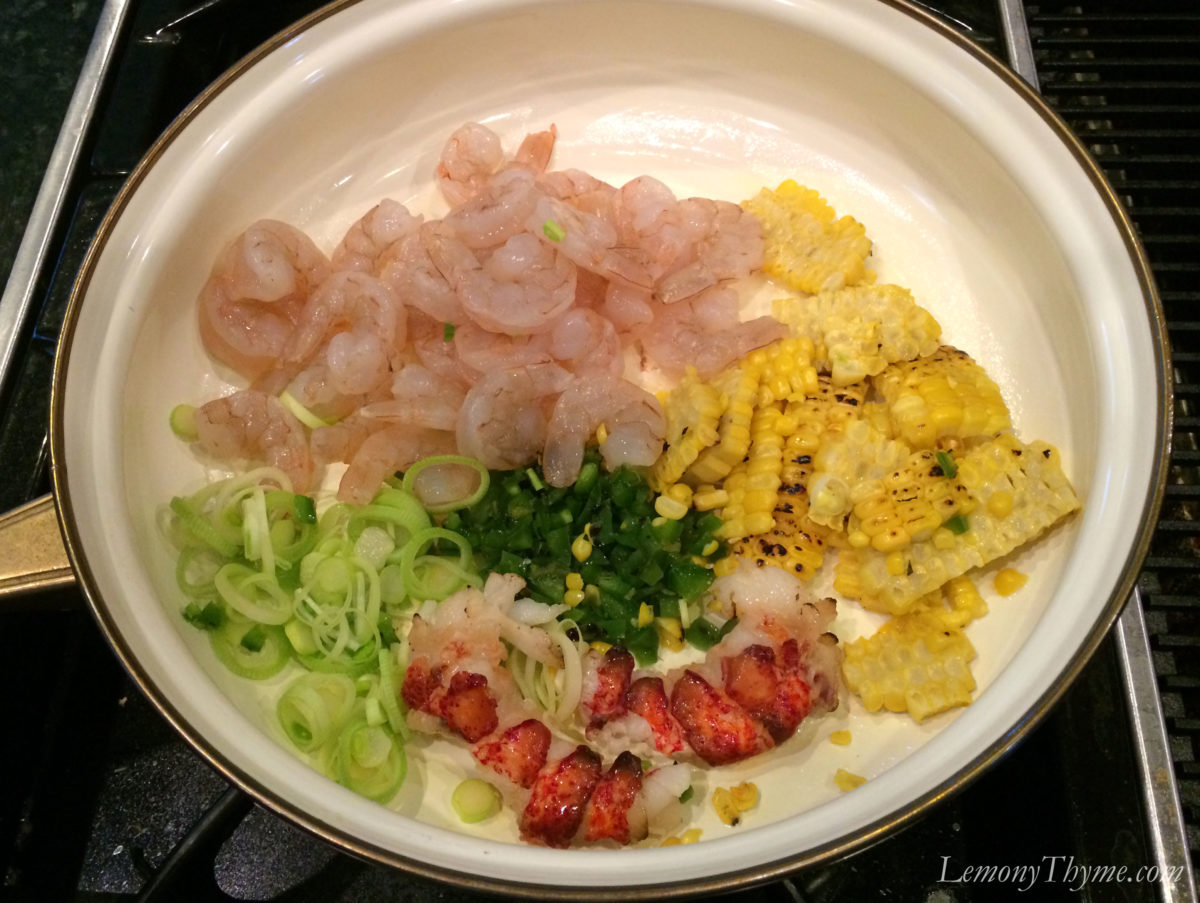 Once the risotto is nice and creamy, sauté shrimp, sliced leek, roasted corn, jalapeno and lobster tail in butter until the shrimp are pink and the lobster is cooked through, 3-4 minutes.