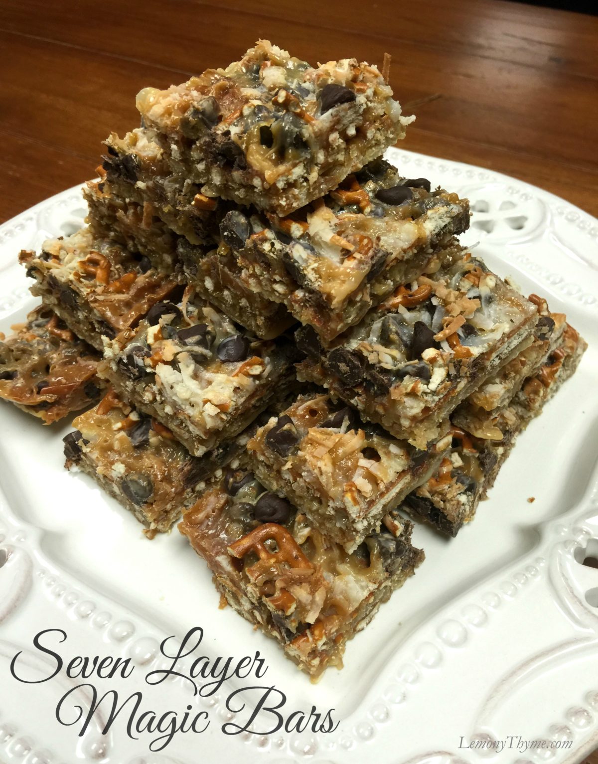 I struggled with what to call these heavenly bars. I kicked around a few ideas. Pretzel Toffee Bars. Chocolate Coconut Layered Love Bars. Magic Bars. Seven Layer Bars. Toothachers Met Their Match Bars. Truth be told…they are a casserole with a little bit of this and a little bit of that. A dessert casserole. I’m not sure anyone would click on a recipe called dessert casserole.