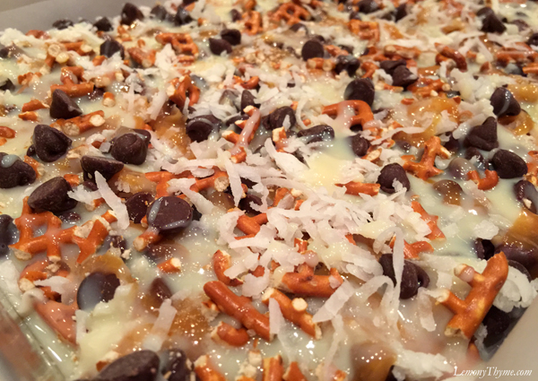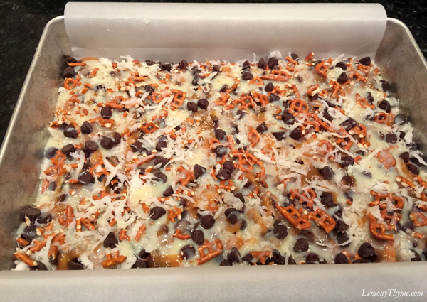 - Press mixture into bottom of parchment lined 9×13 pan. Pour melted caramel over top and spread evenly. Sprinkle on pretzel pieces, chocolate chips, coconut, and chopped pecans.