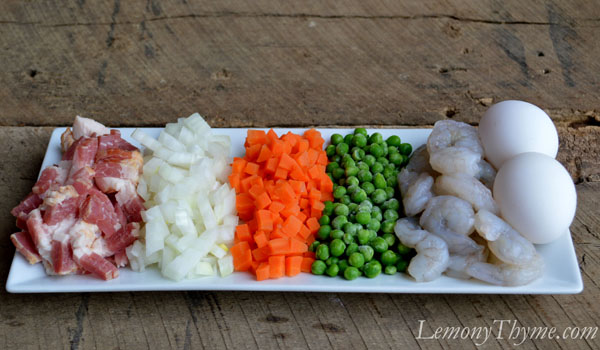 - In a large skillet, cook bacon over medium heat until browned. Add onion and carrot; sauté for 5 minutes. Add in peas, shrimp and 2 cups cooked farro. Stir fry to heat through.