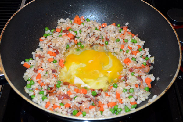 - Make a well in the center. Add in sesame oil. Crack eggs into well and scramble. Drizzle soy sauce over farro mixture. Stir fry to combine all ingredients. Season with black pepper to taste.