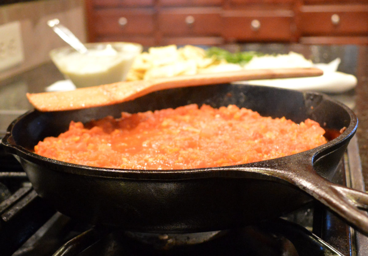 Step 5 ~ Add tomato sauce and bring to a simmer.