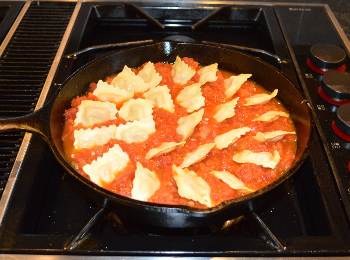 - Nestle ravioli evenly into sauce and gently simmer for 10 minutes