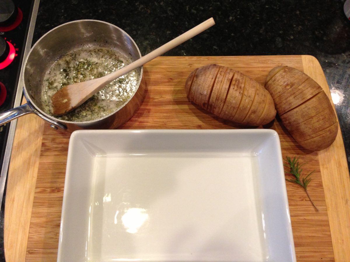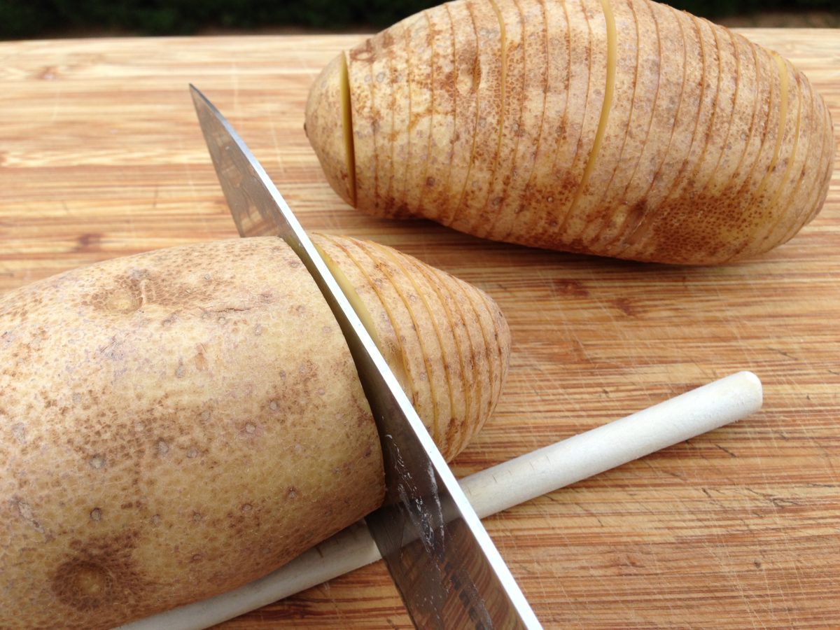 - Cut potatoes into thin slices but not all the way through. Use a handle of a wooden spoon to prevent knife from cutting all the way through.