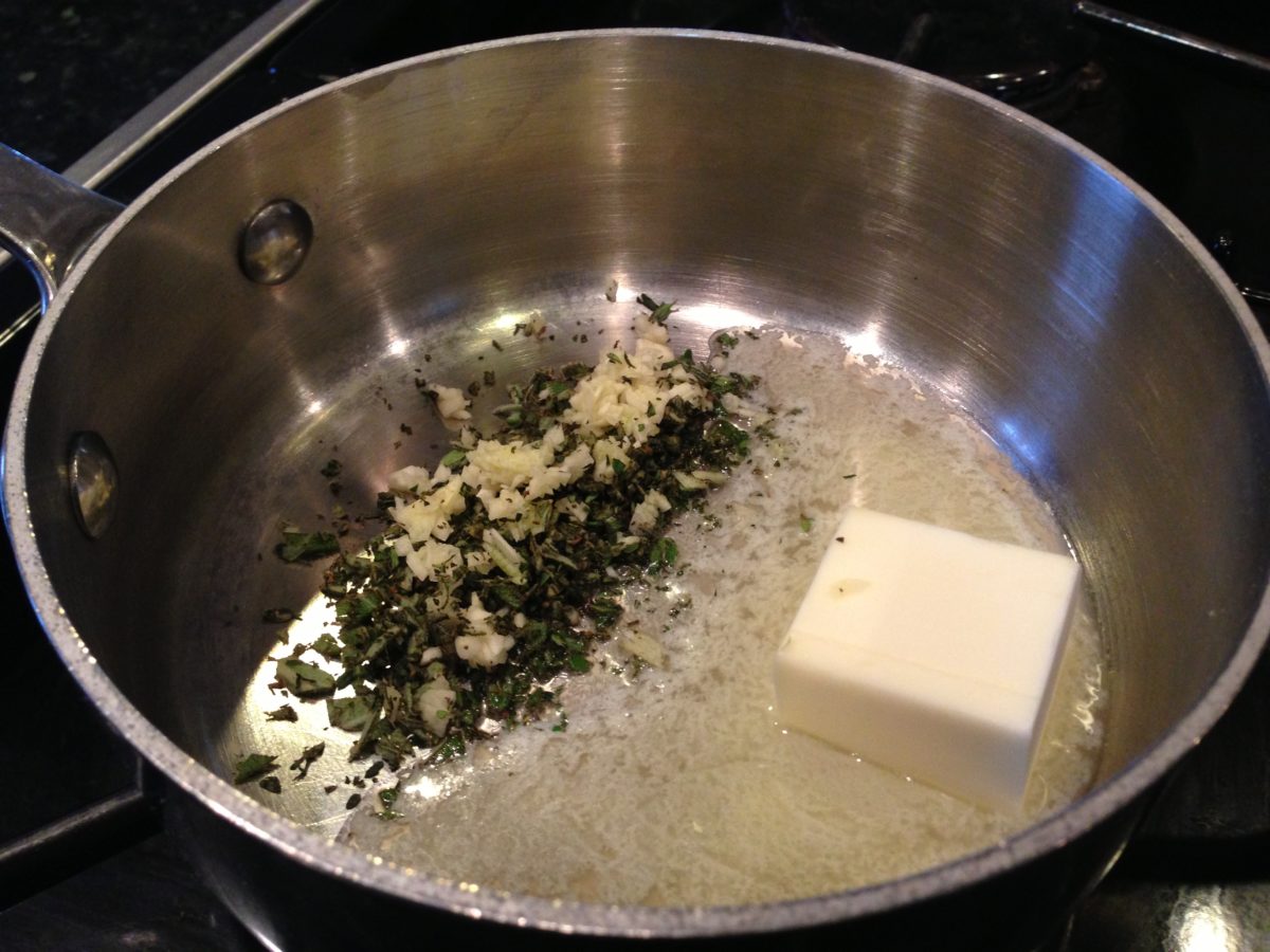- Melt butter over low heat and add minced garlic and herbs and sauté until tender, 2-3 minutes.
