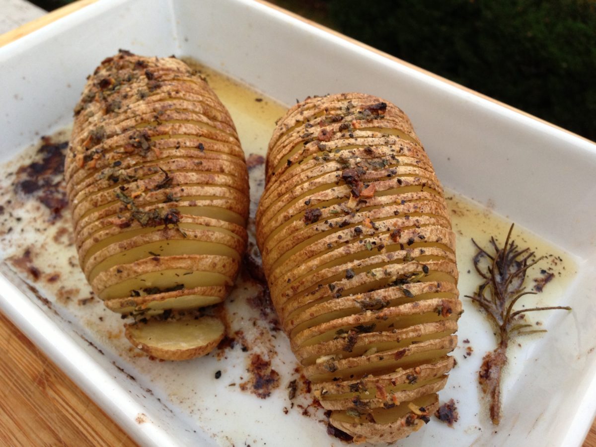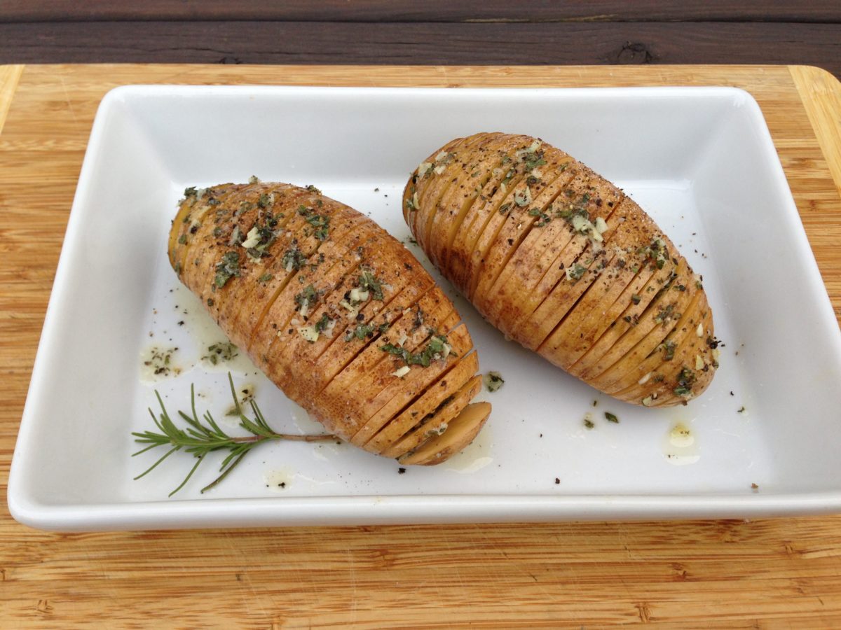 Baking Potatoes, thin sliced, drizzled with fresh herb garlic butter, baked….then topped with grated cheese and bacon…and baked again. Need I say more? Let the pictures speak to you…
