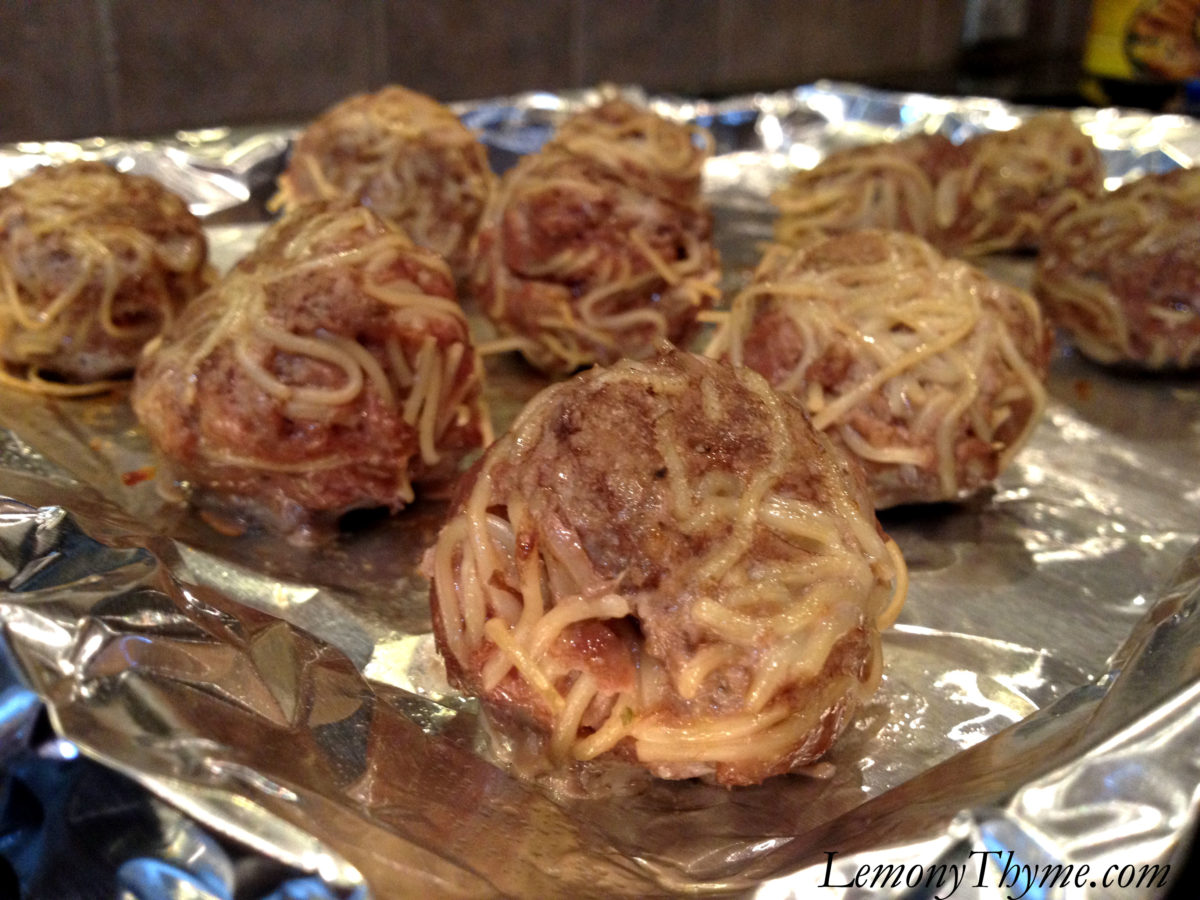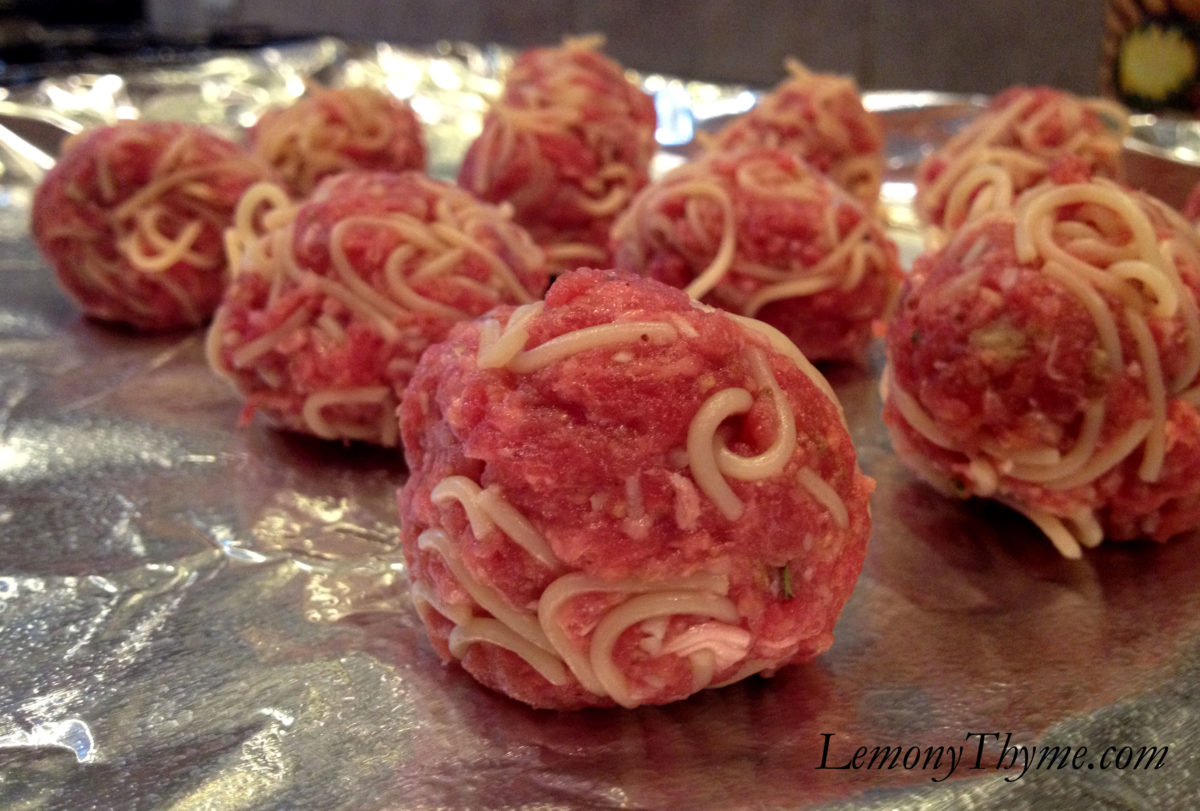 Combine cooked spaghetti with your favorite meatball mixture.  Form them into meatballs….it took a couple minutes to get everything incorporated….but they will come together.