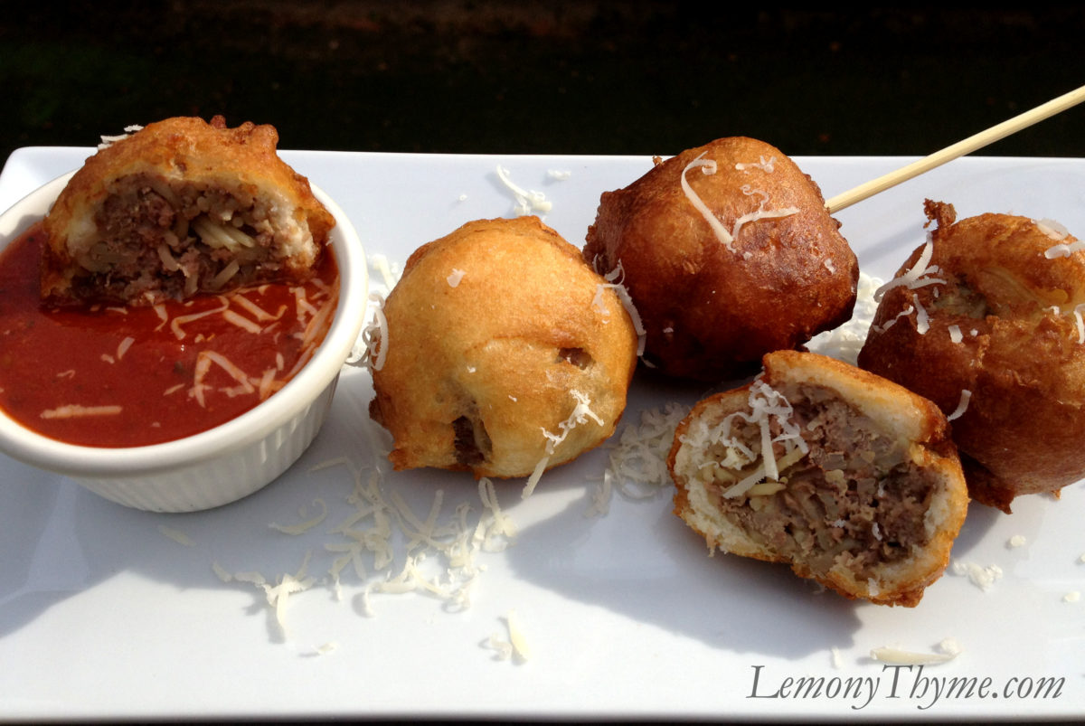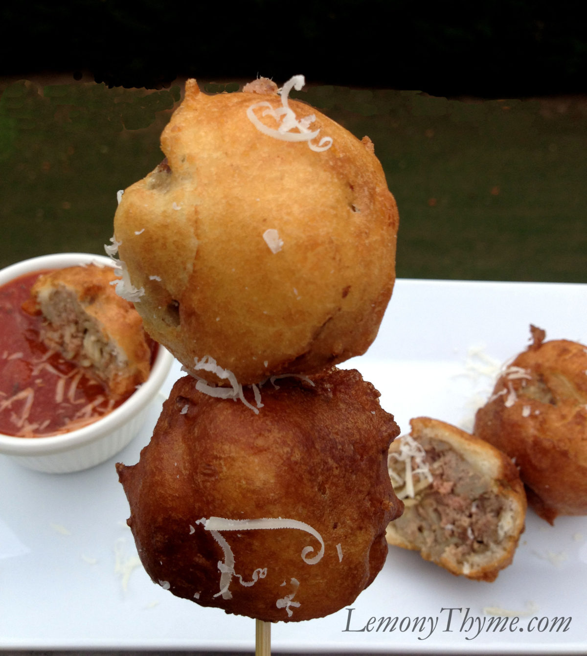Serve them on a stick, with a side of marinara sauce and a sprinkle of Parmesan cheese.  Definitely Fun Fair Food!!  Might try to lighten these up and make them with ground turkey and spaghetti squash rolled in garlic bread crumbs and baked.  Sorry, that was a lame attempt at appearing to be health conscience.  Clearly that’s not the focus of fair food vendors, nor mine with this recipe.  Enjoy!!