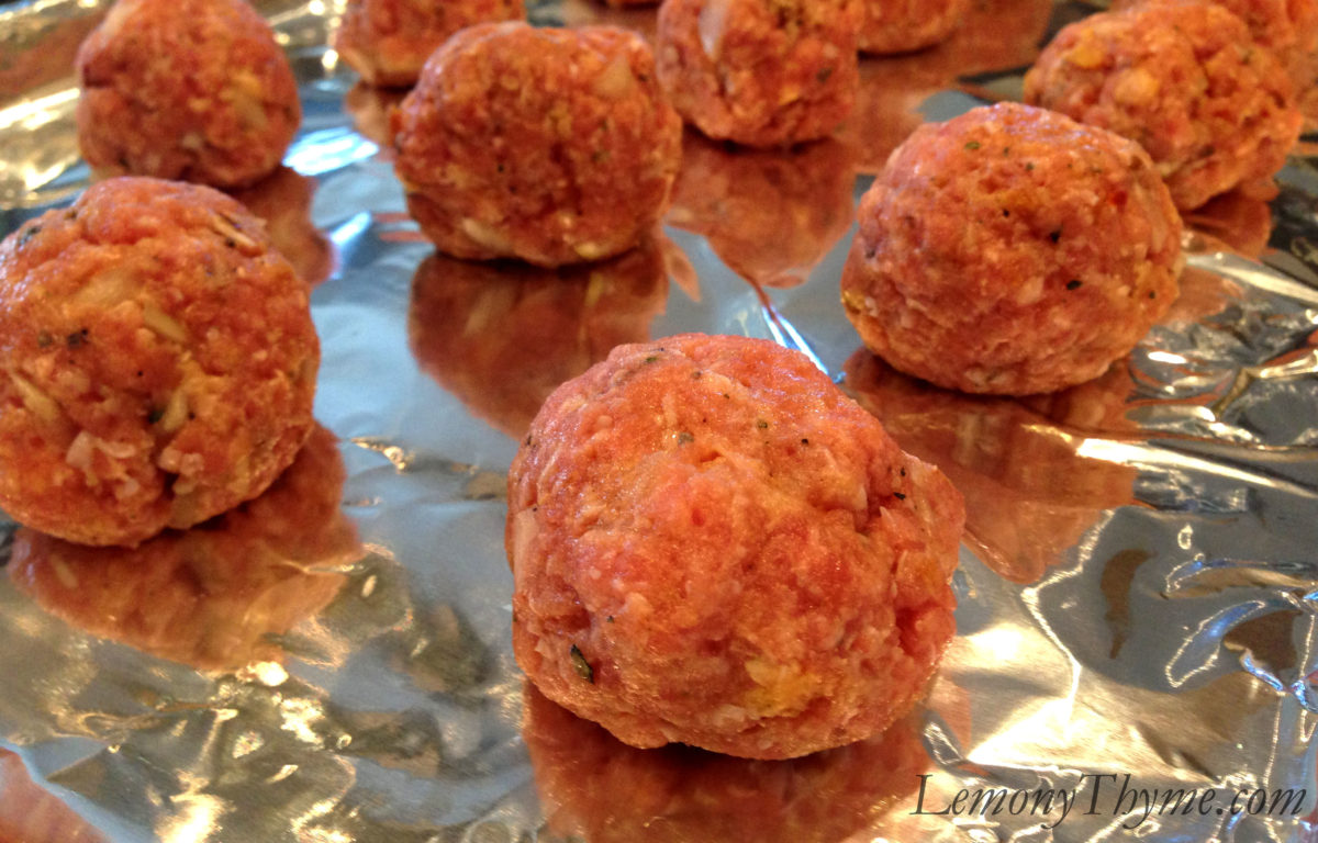 - Combine all meatball ingredients, until just blended (do not overwork). Form into 2″ balls and place on foil lined baking sheet, we made 15.