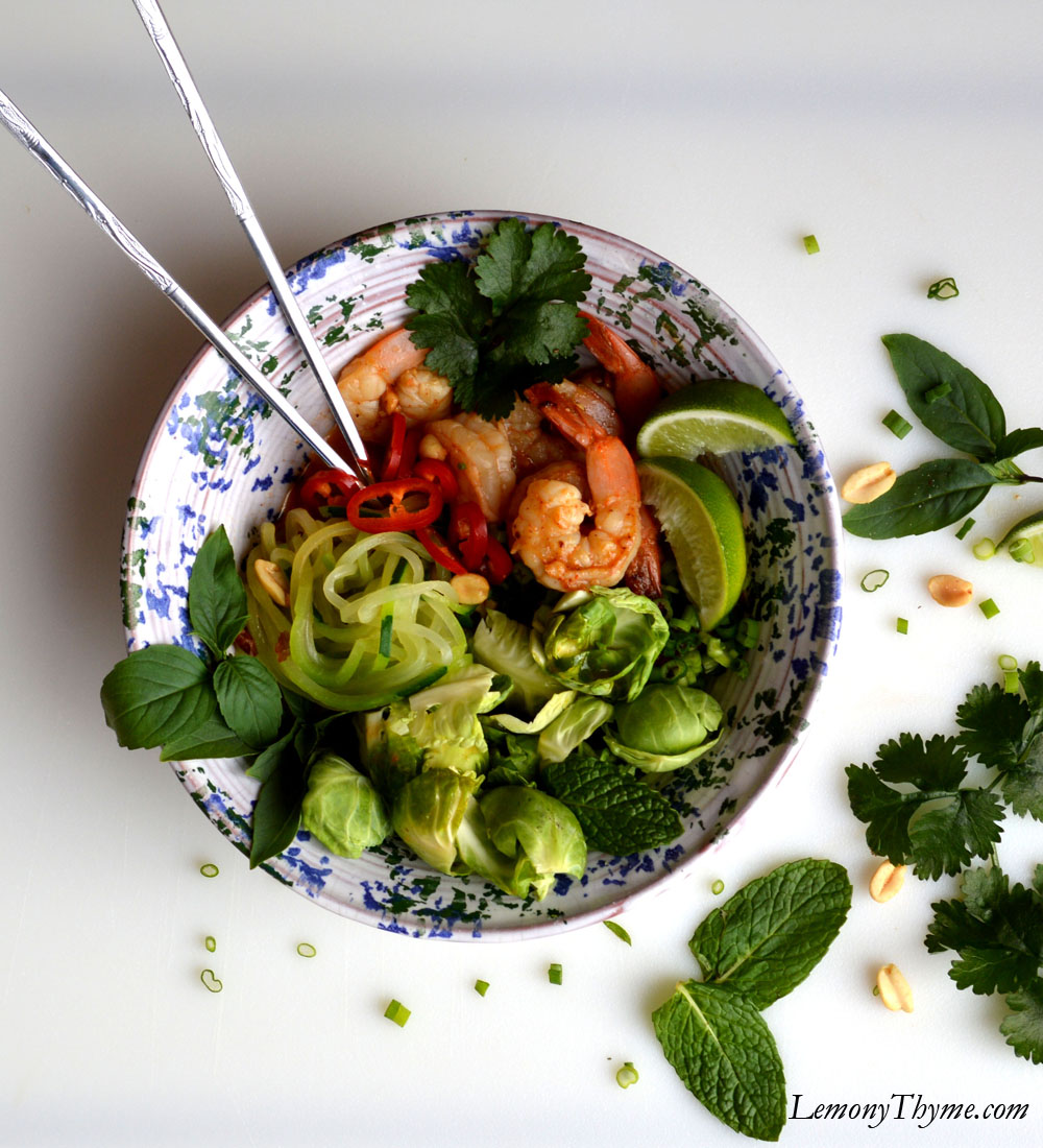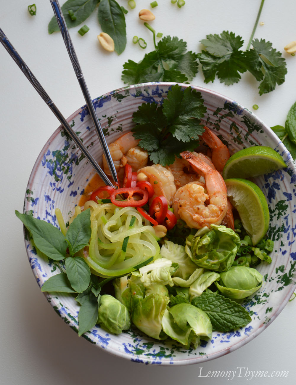 I made a quick sauce for the shrimp that consisted of soy sauce, peanut butter, sesame oil, sriracha sauce, and garlic.  A quick 1-2 minute sizzle in our hot wok, followed by chicken broth, is how this awe-mazing hot & spicy broth came together.  Poured over zoodles and Brussels sprout leaves, garnished with red chili peppers, scallions, peanuts and fresh herbs.
