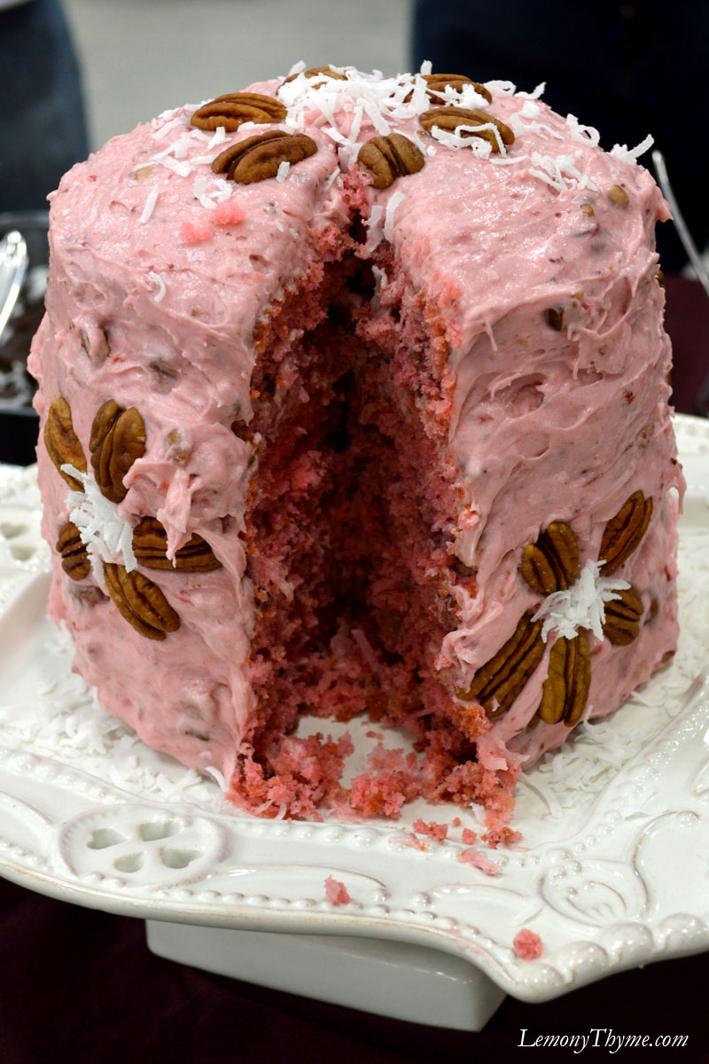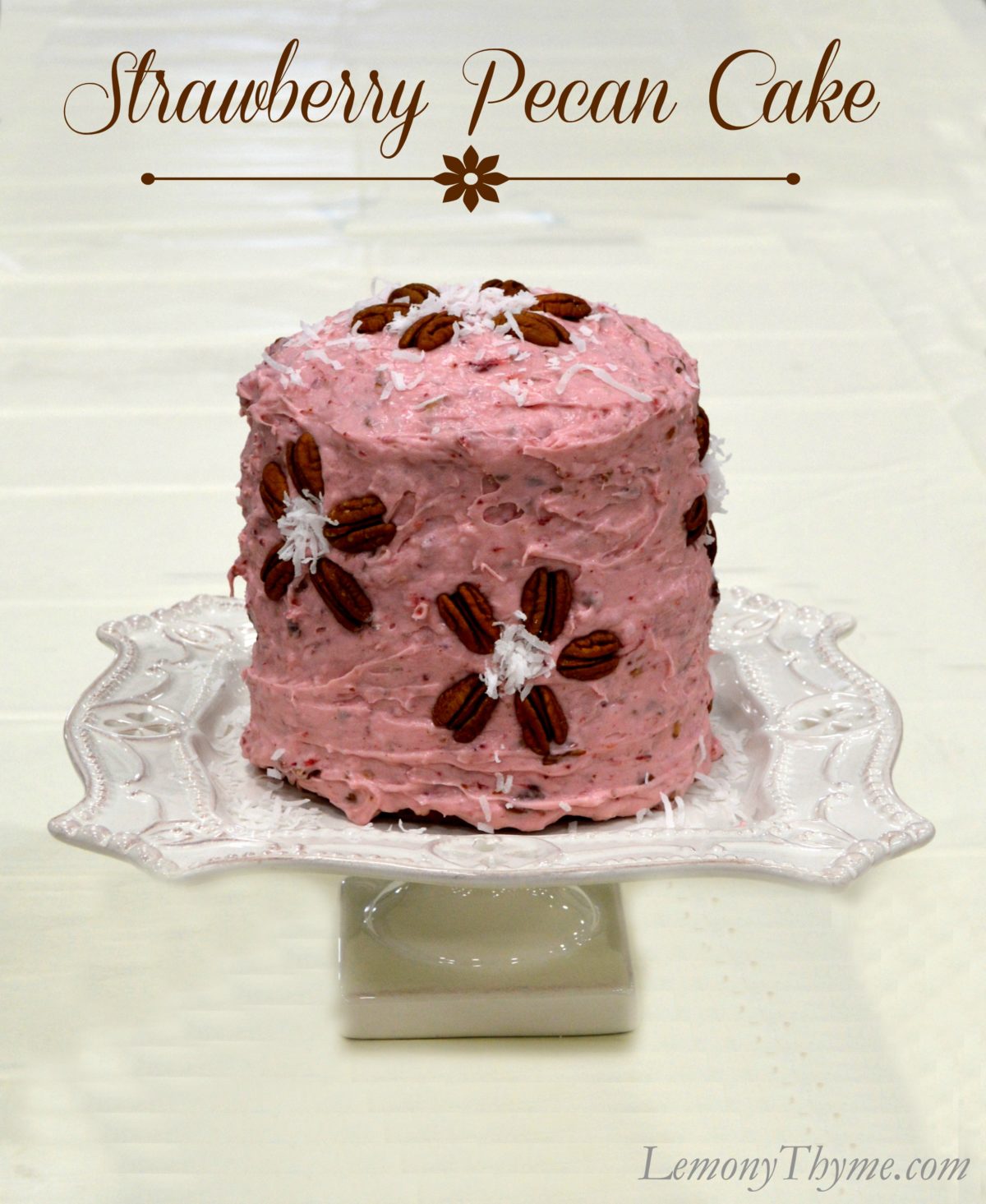 This Strawberry Pecan Cake is deliciously moist with hints of coconut.  I slightly adapted the icing recipe because I made this a four layer cake.  The addition of cream cheese made the icing a bit sturdier, but just as sweet and creamy.