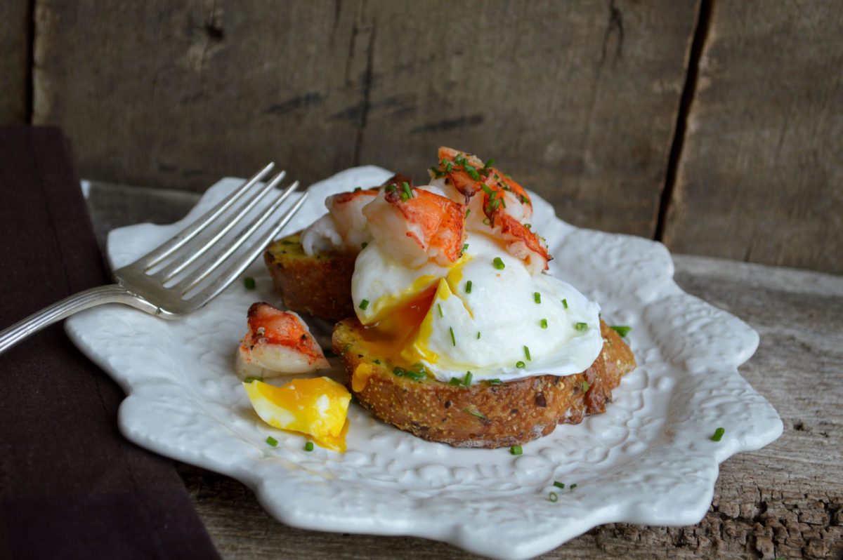 ~ Lobster Topped Poached Egg on Savory French Toast ~