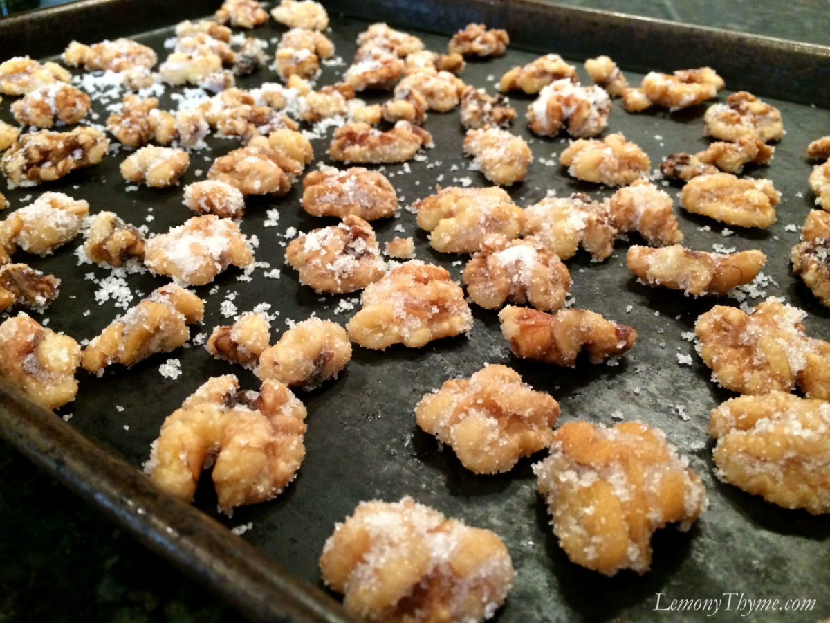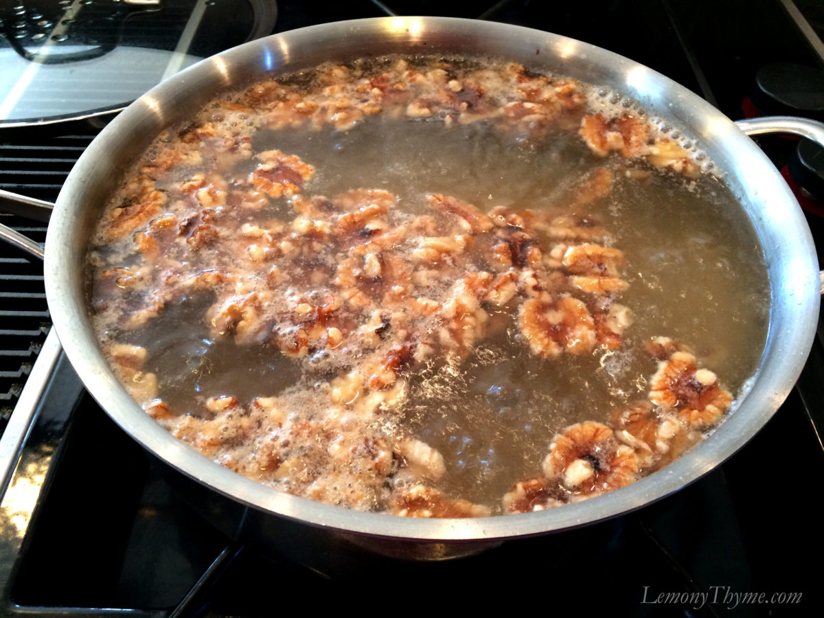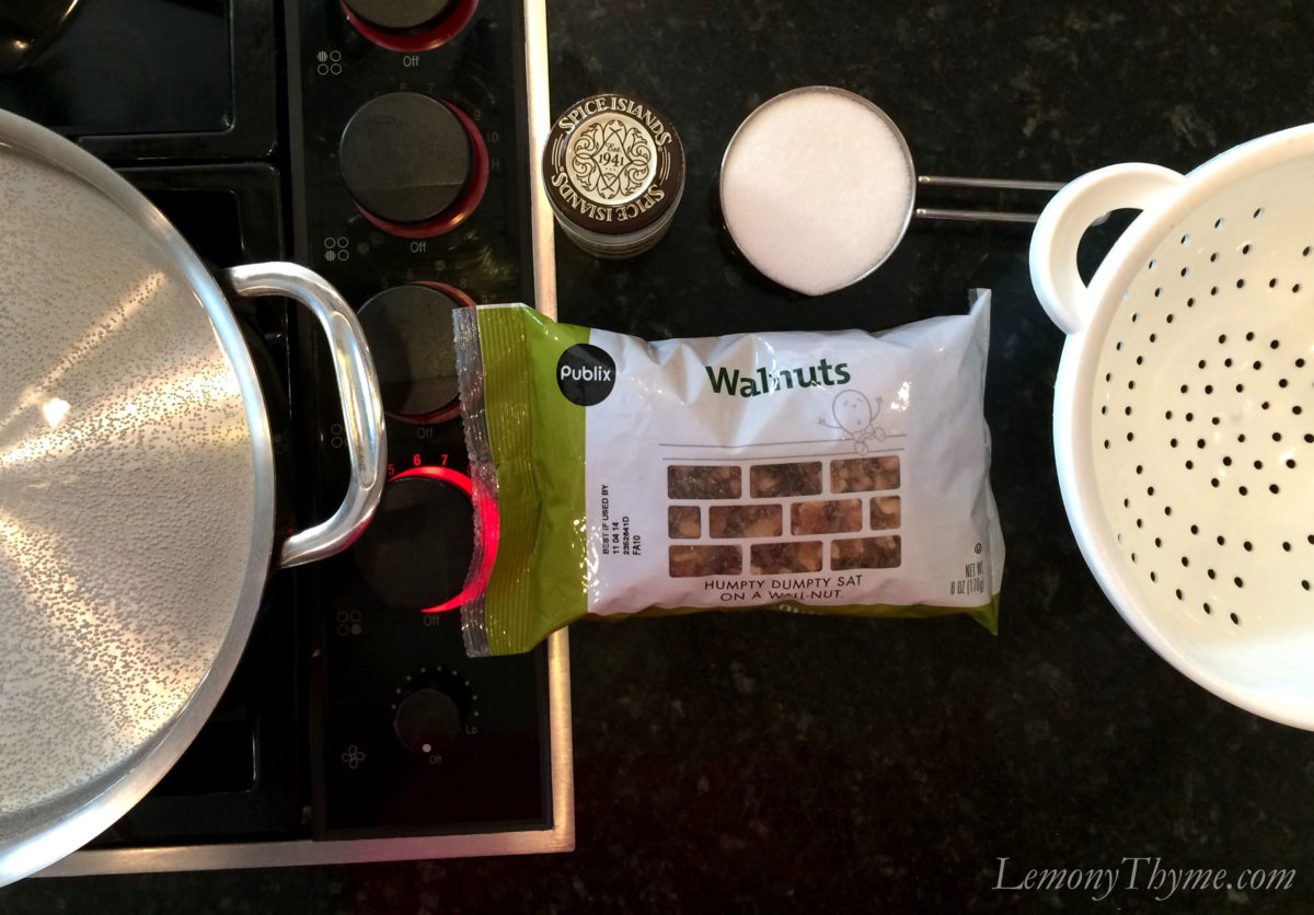 - Bring a large pot of water to boil. Simmer walnuts for 5 minutes. Drain, do not rinse. Pat the warm walnuts dry and transfer to a bowl. Sprinkle with sugar and gently toss to coast. Spread in single layer on rimmed baking sheet and allow to sit uncovered overnight.