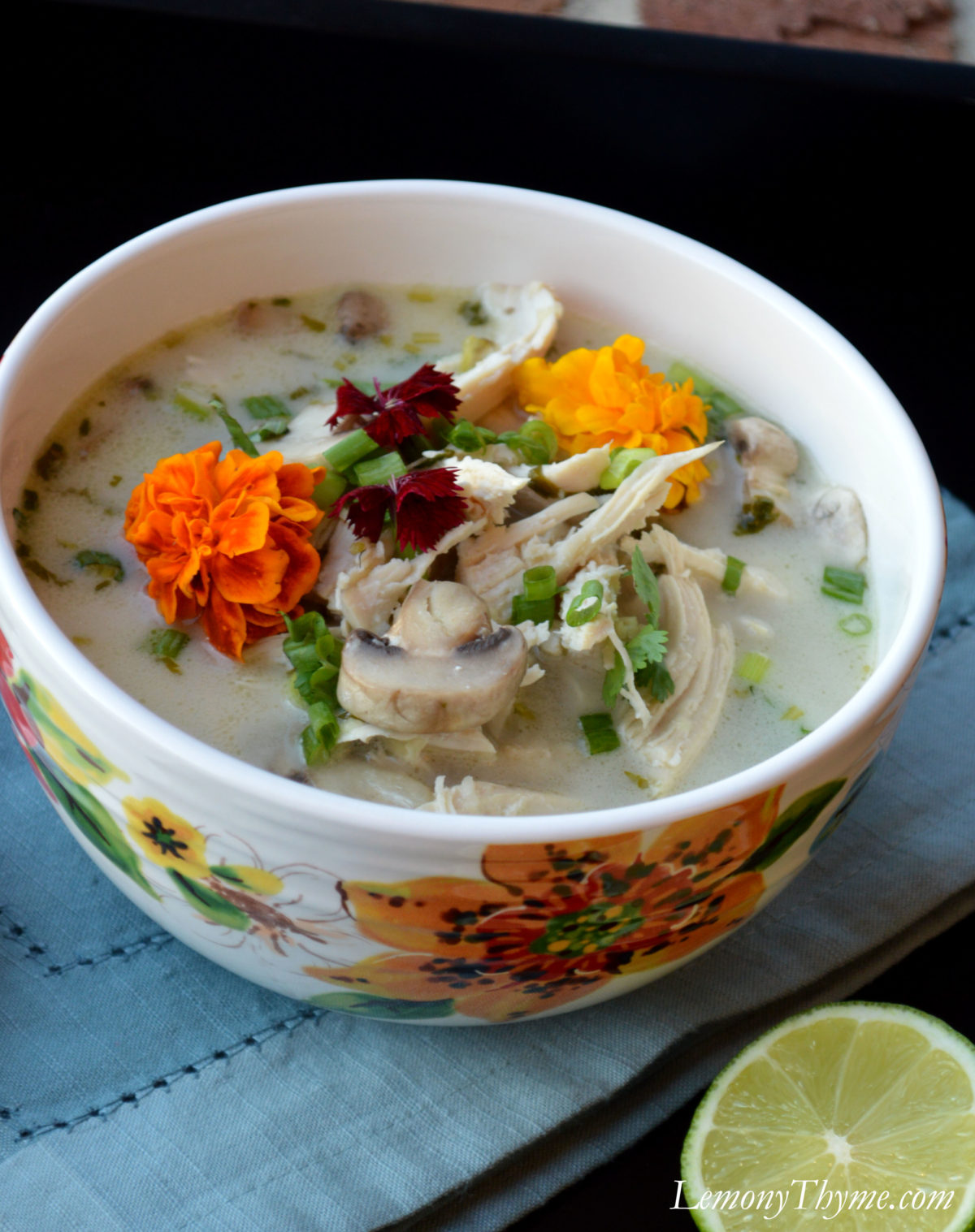 When picking up the lemon grass I found these gorgeous edible flowers.  I had already chosen this beautiful flower bowl and couldn’t resist adding them to our Thai Coconut Chicken Soup, also known as Tom Kha Gai.