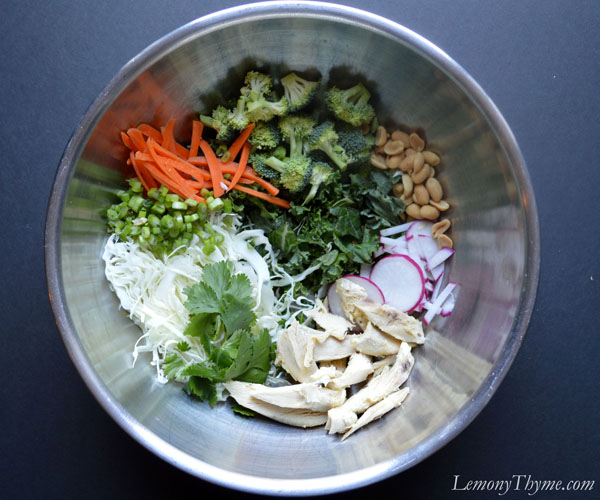 The base for this great dish(es) is a big bowl of fresh raw veggies with a variety of colors and crunch. I used cabbage, carrots, kale, radish, broccoli, scallions, fresh cilantro, and a handful of peanuts. Use your favorites, this is a great chance to work through items in that veggie crisper. I then added some shredded cooked chicken and tossed it in a little peanut sauce. You can make your own sauce, I have a recipe here or you can use store bought (we love House of Tsang Bangkok Padang Peanut Sauce).