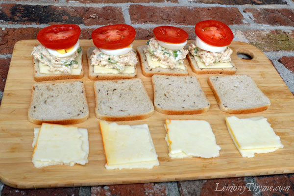 • Layer the party rye with piece of muenster, piece of Havarti, scoop of tuna salad, egg slice, tomato slice, piece of muenster, piece of Havarti and top with bread slice. Repeat.