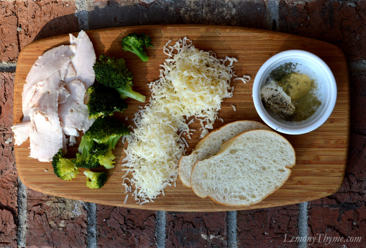 - Combine Dijon herb spread ingredients and spread on both slices of bread. Layer one slice with shredded gruyere cheese, smoked turkey, broccoli florets, and shredded parmesan cheese; top with second slice of bread.
