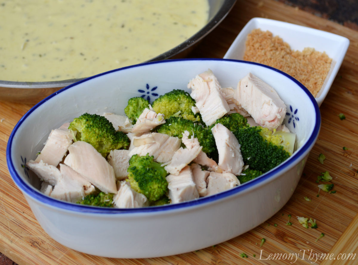 - Cut turkey (or chicken) and broccoli into bite-sized pieces and place in buttered casserole dish. Reserve.