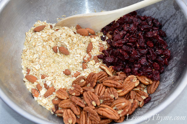 Put the toasted base ingredients in a large bowl and add 1 cup mixed nuts (I used pecan halves) and 1 cup dried cranberries. Reduce oven temperature to 300 degrees.