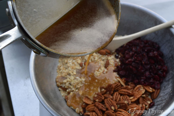 - In a small saucepan melt butter over medium-low heat, add in honey, maple syrup, vanilla, brown sugar and salt. Stirring constantly bring to a boil and whisk for one minute, then remove from heat. Carefully pour hot syrup over dry ingredients and stir until well coated.