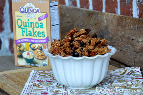This Vanilla, Almond & Cranberry Quinoa Granola has just the perfect amount of sweetness from the cranberries, honey and maple syrup. I really enjoyed the whole almonds versus sliced that I typically use when making Granola Bars, they add a nice crunch. If you’re not familiar with Quinoa flakes, I was able to find them in my supermarket in the same isle where you find quinoa, rice, couscous, etc.