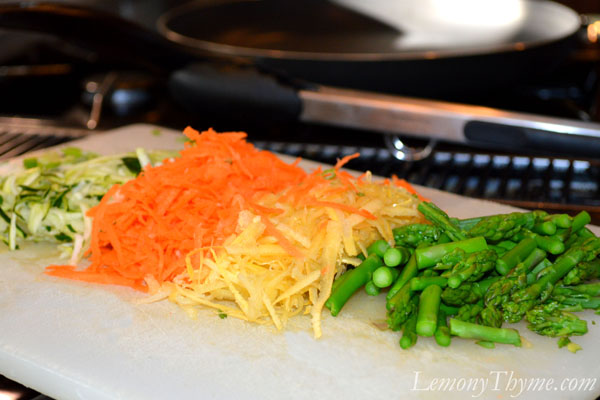 - Blanch asparagus for 2-3 minutes, then cut into small pieces. Slice scallions. Shred remaining veggies then squeeze between paper towels to remove excess moisture.