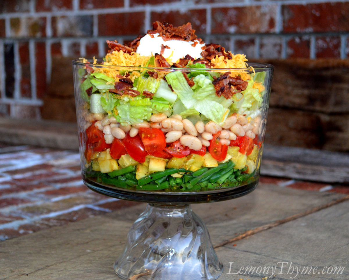 The last step to complete this salad is to sprinkle on the crumbled crispy bacon. It’s how we started this dish and it is the icing on the cake that finishes it!! Here at Lemony Thyme we’ll call this the Warm 8-Layer Salad, giving full credit and praises to Rachel Ray for creating the recipe.