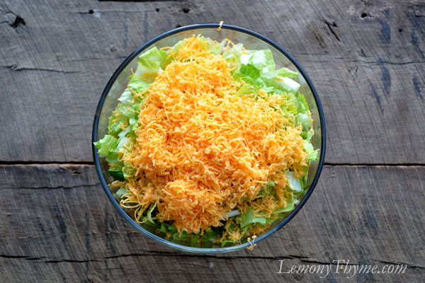 Shredded cheddar cheese is the next layer and goes right on top of the lettuce.
