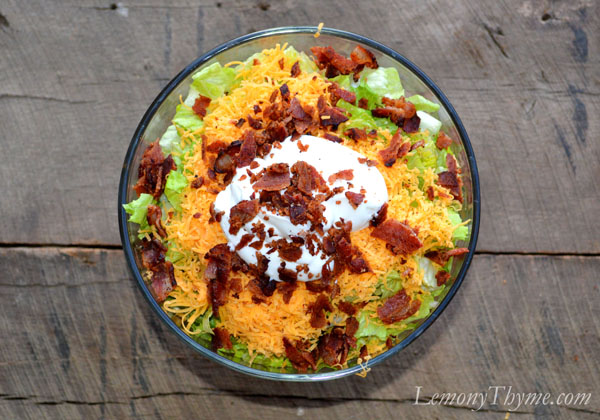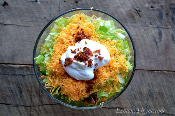 - Top the baked vegetable bowl with layers of the lettuce (Layer #5) and cheddar cheese (Layer #6). Top with the yogurt (Layer #7), then crumble the bacon and sprinkle on top (Layer #8).