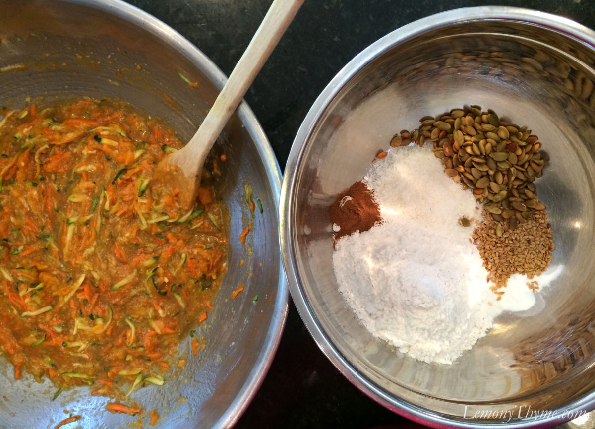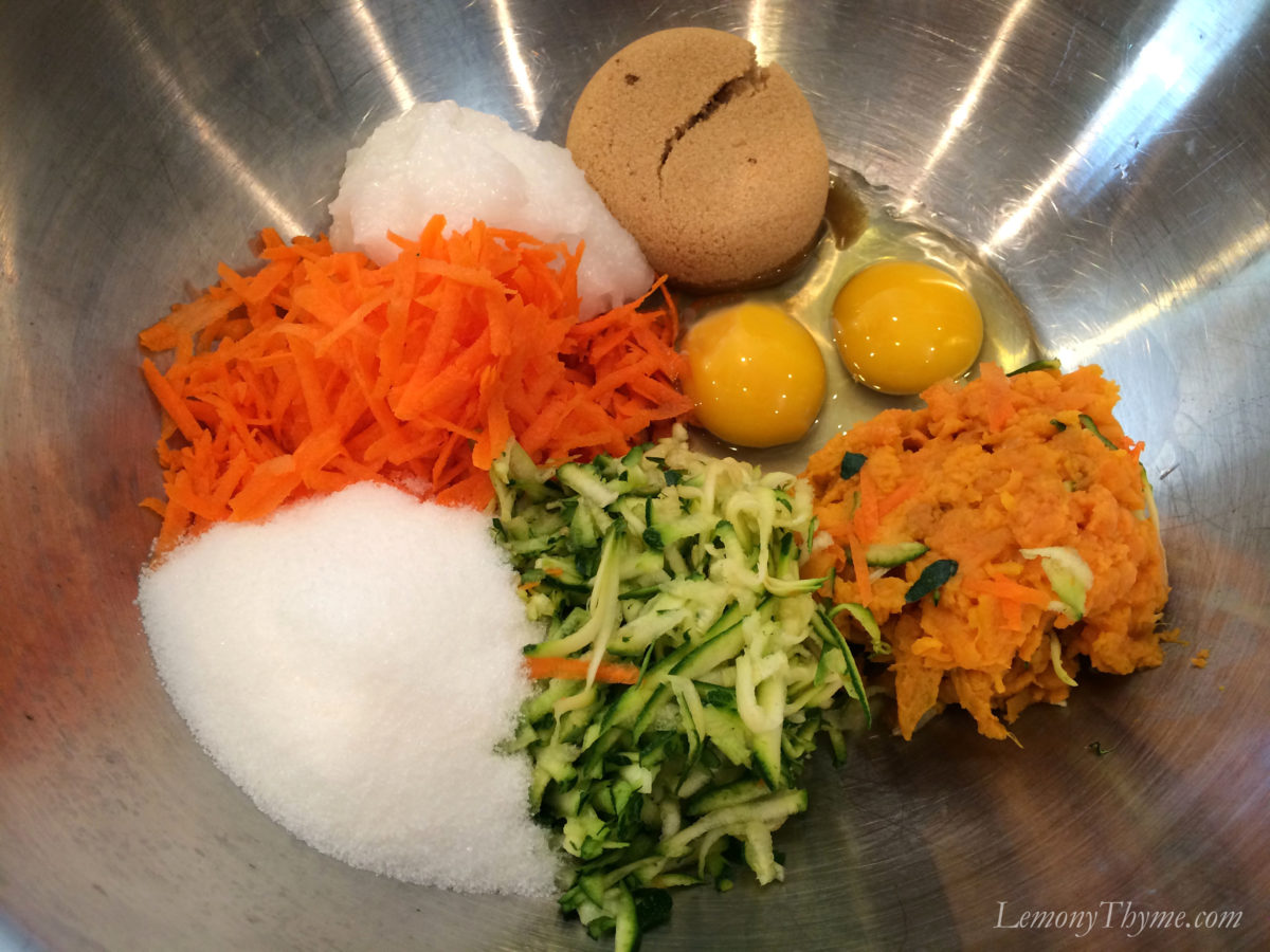 In addition to mashed sweet potato, and to the delight of my trusty kitchen side-kicks Lilah and Scrappy Thyme, I added shredded carrots and zucchini to the mix. They are coo coo for carrots.