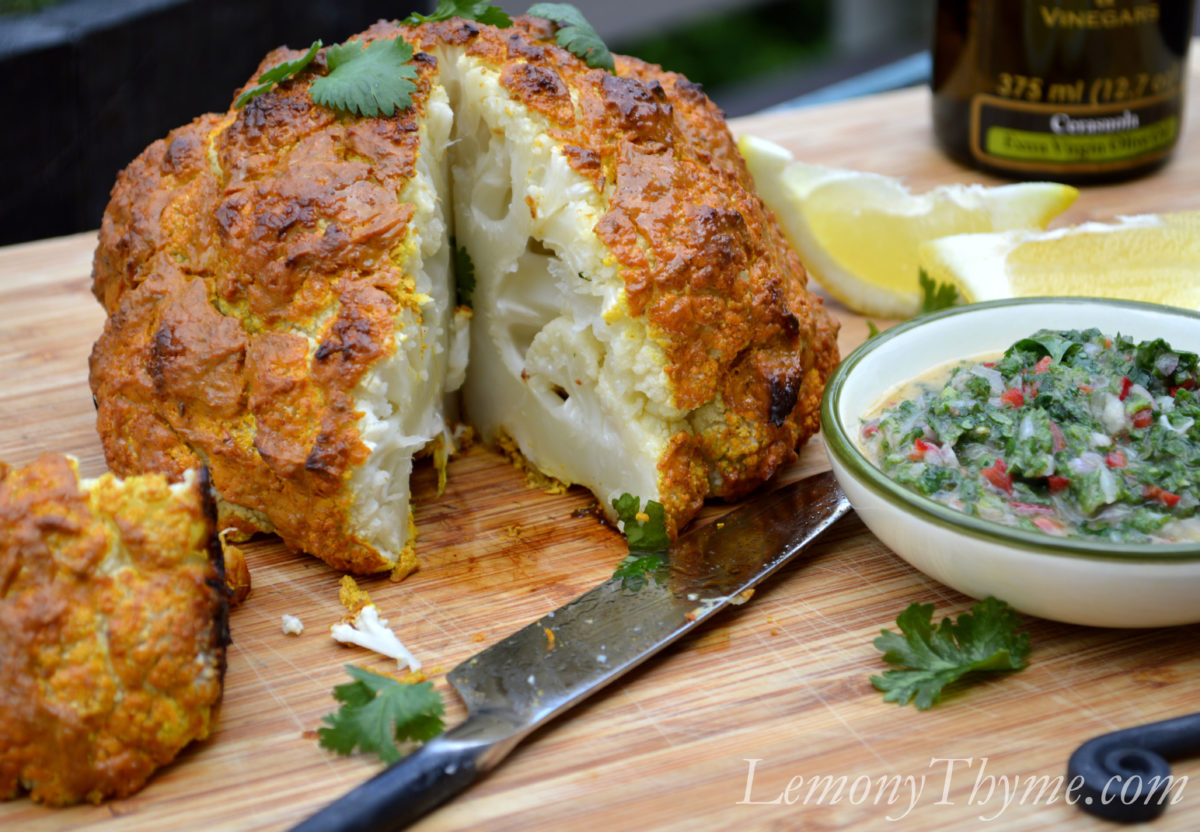 Whole Roasted Tandoori Cauliflower with Mint Chutney.